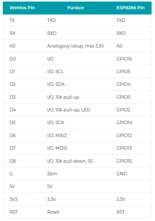 WeMos D1 obsahuje rozložení pinů skoro identické s Arduino UNO. Všechny I/O piny mají přerušení, PWM, I2C a 1-Wire , mimo pin D0.