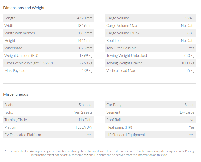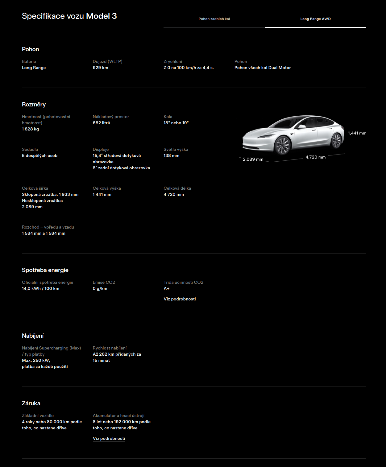 Specifikace vozu Tesla Model 3 Long Range AWD 2024