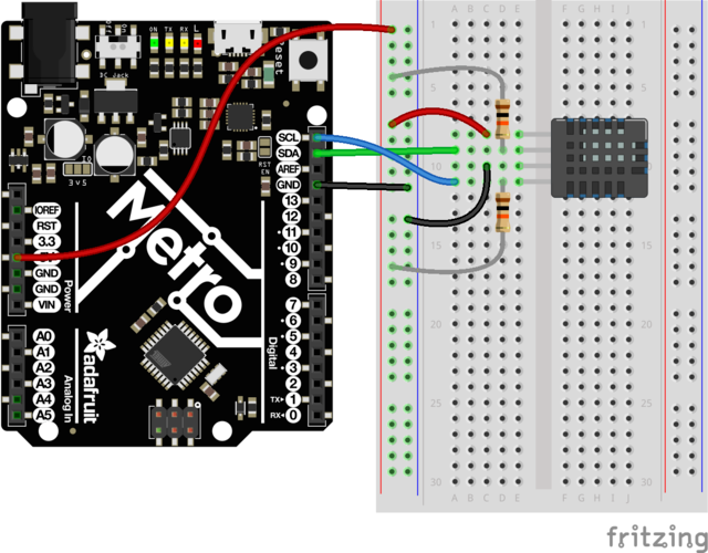 Příklad senzoru AM2320, kde je potřeba přidat pull up rezistory, aby bylo zapojení funkční: