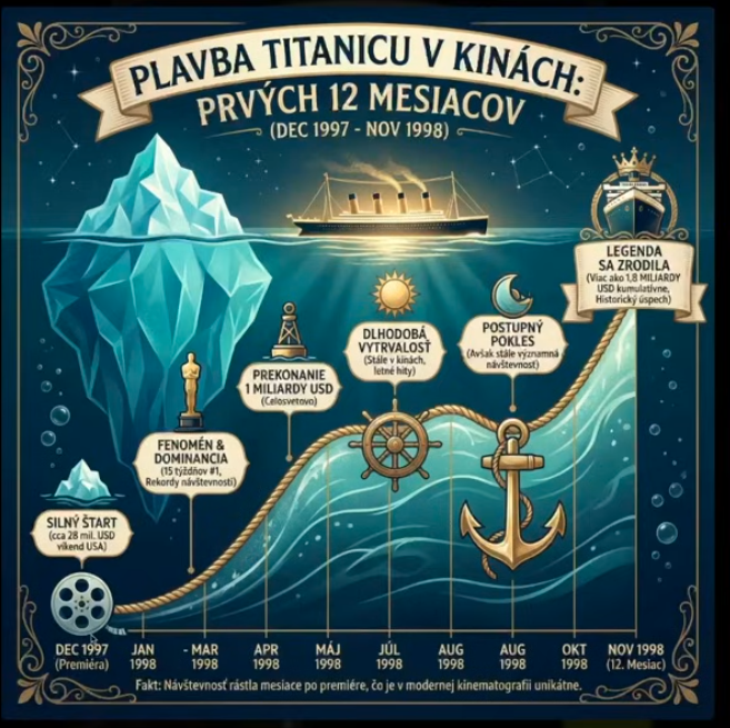 Dohľadaj si informácie o návštevnosti filmu Titanic v kinách a urob k tomu infografiku prvých 12 mesiacov od premiéry Pútava infografika ladiaca s danou témou