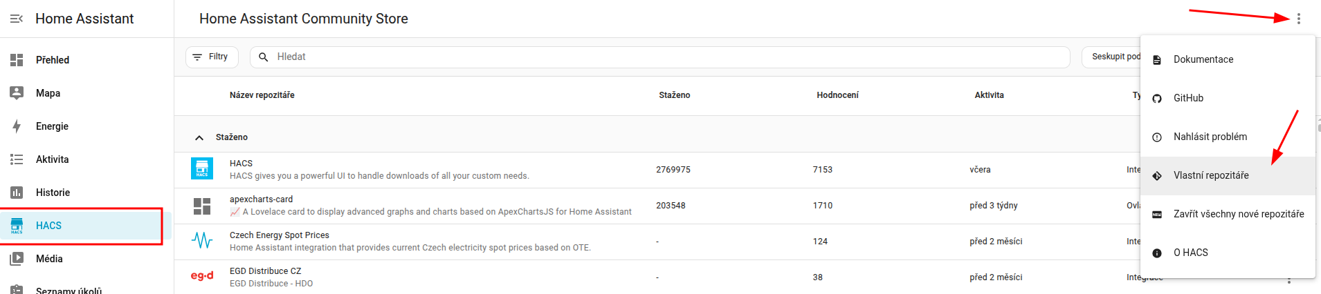 Jako řešení se ukázalo HACS (Home Assistant Community Store).